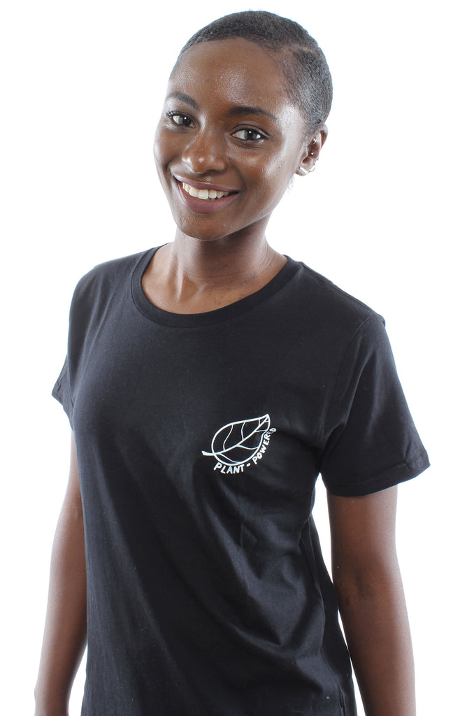 A hand-drawn leaf with the words "plant-powered" written underneath.